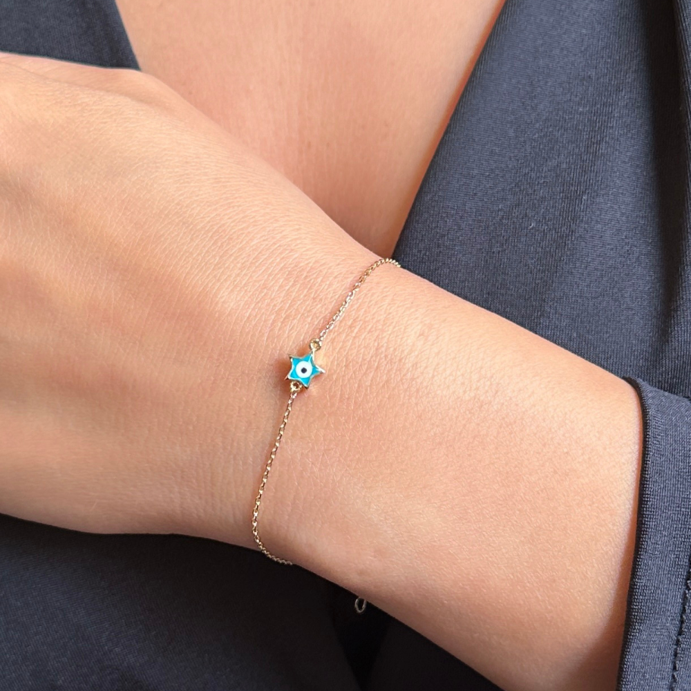 صُنع هذا السوار الرائع ببراعة من الذهب الأصفر الخالص عيار 18 قيراطًا، ويتميز بتصميم نجمة صغيرة وعين رقيقة مرصعة بأحجار كريمة زرقاء فيروزية. يجمع هذا السوار بين الأناقة والحماية، وهو قطعة أساسية لأي امرأة عصرية.