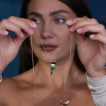 Crafted with 18 carats of solid yellow gold, this necklace boasts a unique honey drip design and vibrant green enamel. Elevate any outfit with this luxurious and eye-catching jewelry. 4.08g